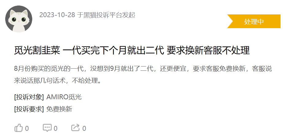 這些事件也進一步引發(fā)了消費者對于AMIRO覓光利用產(chǎn)品升級的信息差來定價的質疑。據(jù)黑貓投訴顯示,有消費者投訴AMIRO覓光“山姆賣2999,我買的時候4599,溢價1600”“覓光割韭菜,一代買完下個月就出二代,要求換新客服不處理”。