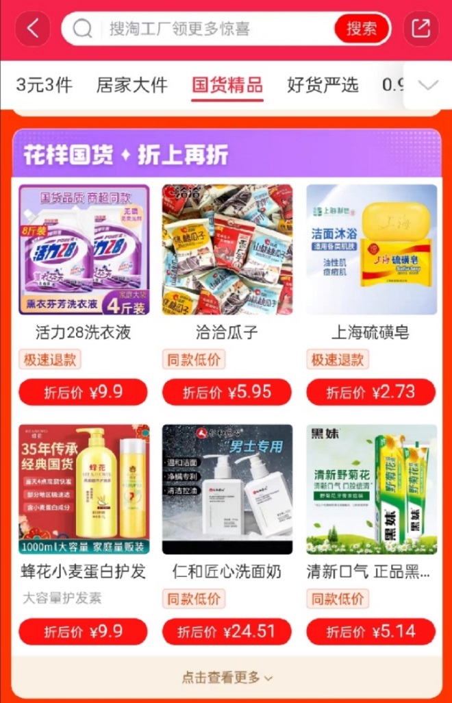 11月7日晚,淘工廠迅速反應(yīng),在官方直播間回應(yīng)稱,目前他們已經(jīng)整合了直播間、達(dá)人直播以及淘工廠會(huì)場(chǎng)資源,在雙11主會(huì)場(chǎng)內(nèi)專門搭建了“花樣國(guó)貨,折上再折”的國(guó)貨樓層,“上海硫磺皂”就排在醒目的樓層首位。