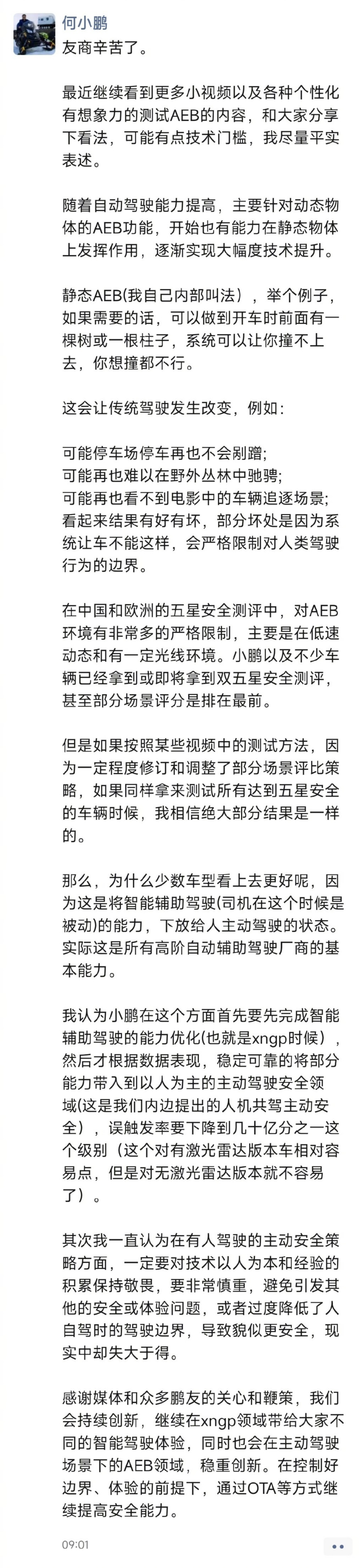 持相反觀點(diǎn)的人還不少。何小鵬今早就在微博給出了回應(yīng)。何小鵬的核心觀點(diǎn)是:首先高速AEB存在安全隱患和體驗(yàn)的問(wèn)題,當(dāng)前要做的是優(yōu)化智能輔助駕駛能力,降低誤觸率;其次在有人駕駛的主動(dòng)安全策略方面,要更加謹(jǐn)慎。