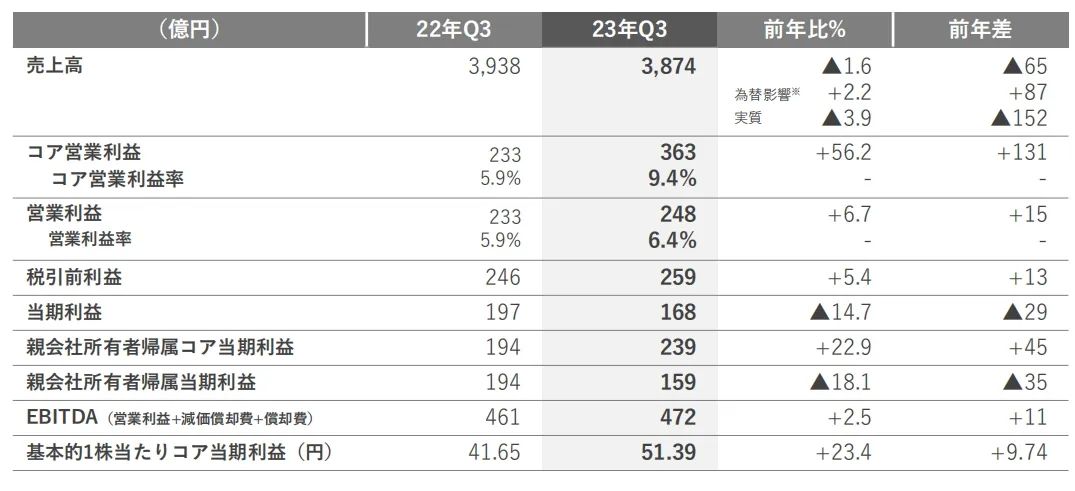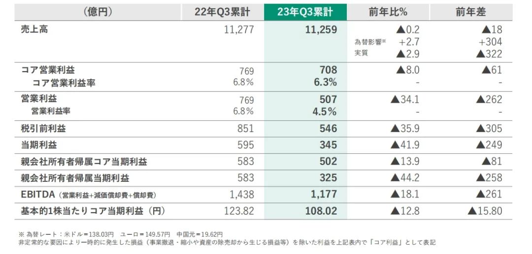單從第三季度來看,銷售額達(dá)3874億日元(約合人民幣186.89億元),比去年減少65億日元(約合人民幣3.14億元),同比下降1.6%,受匯率影響實際上下降3.9%。核心營業(yè)利潤為363億日元(約合人民幣17.51億元),比去年上升131億日元(約合人民幣6.33億元),同比增長56.2%。