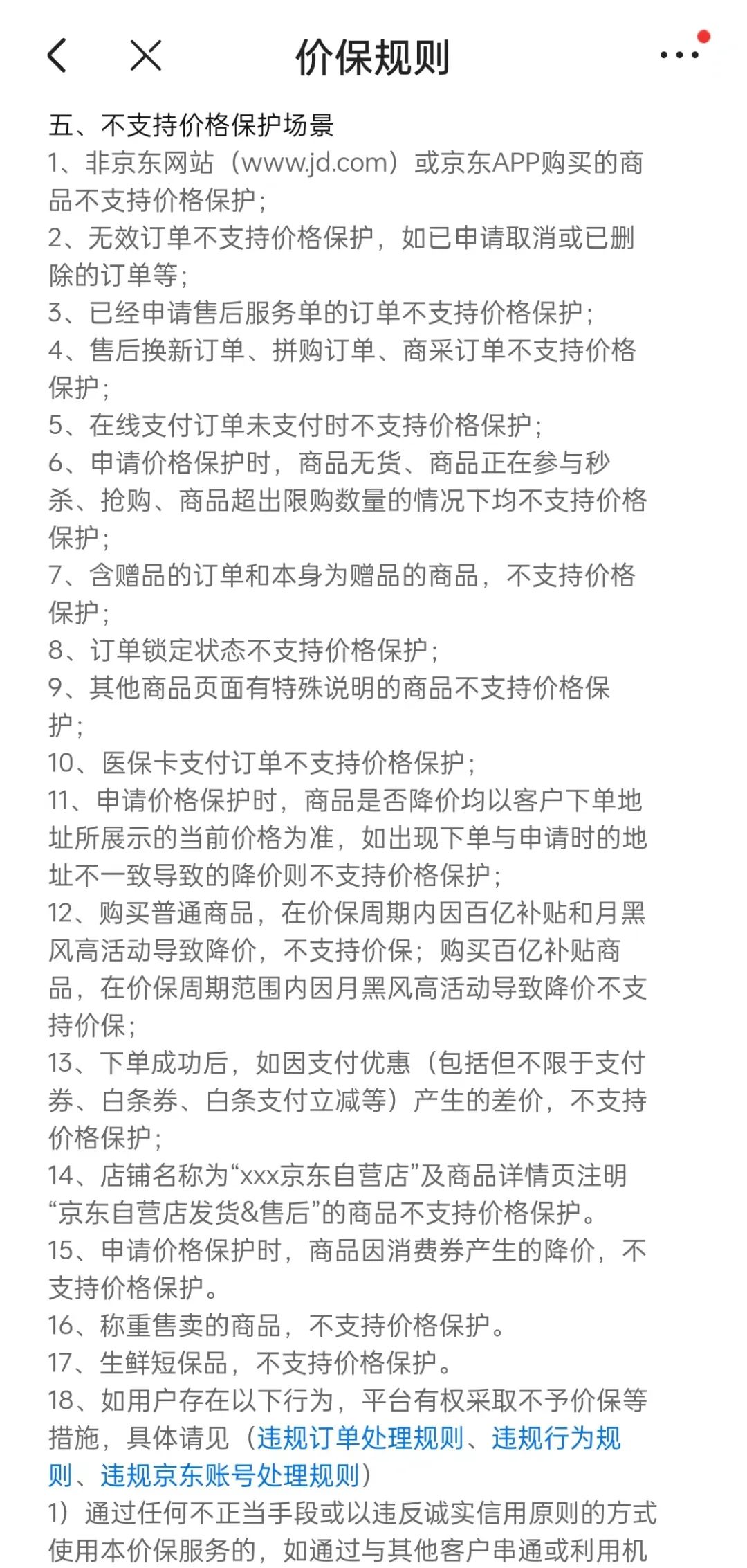 二是附加規(guī)則太多。就以京東自營的價(jià)保規(guī)則為例,其一共列出了整整18個(gè)不支持價(jià)保的場景。包括商品正在參與秒殺/搶購、購買的是百億補(bǔ)貼商品、因支付優(yōu)惠產(chǎn)生差價(jià)、因消費(fèi)券產(chǎn)生降價(jià)等等。