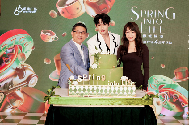 恒隆地產(chǎn)副董事 內(nèi)地業(yè)務(wù)張琳娜女士(右一)、昆明恒隆廣場總經(jīng)理洪建山先生(左一)及青年演員張彬彬(左二)共慶昆明恒隆廣場四周年