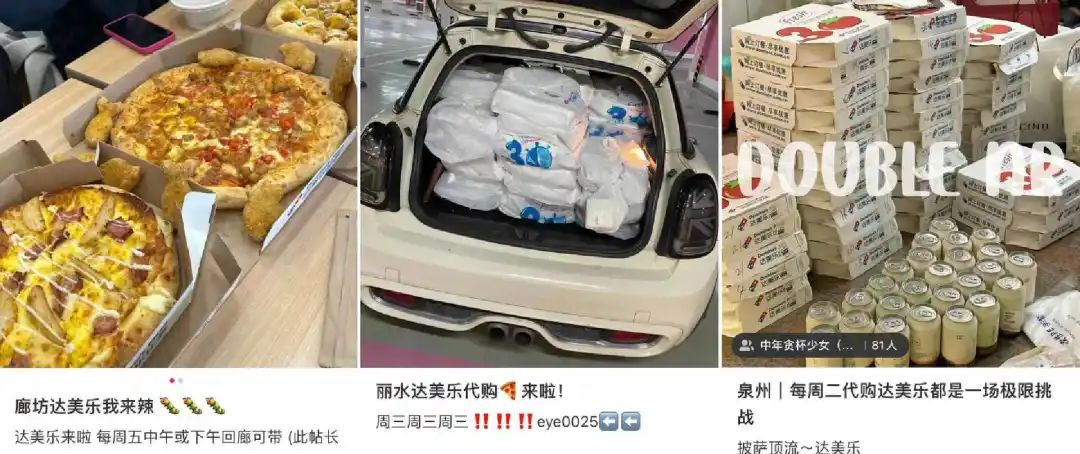 所以,達(dá)美樂(lè)也是繼山姆、鮑師傅之后,能發(fā)展起代購(gòu)的一個(gè)“品類(lèi)”。只要達(dá)美樂(lè)的圍擋出現(xiàn)在某座城市的商圈,周邊的地級(jí)市和縣鄉(xiāng)鎮(zhèn)都會(huì)在第一時(shí)間得到速報(bào),預(yù)備代購(gòu)業(yè)務(wù)。