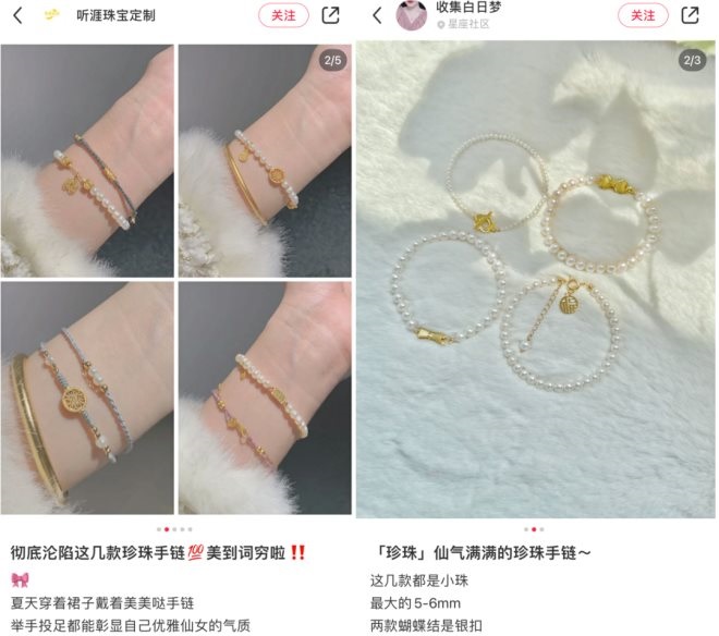 這邊露露還在直播間主播推薦和小紅書(shū)筆記中挑選中意的珍珠飾品,另一邊,95后“黃金愛(ài)好者”慶仔則開(kāi)始搜尋帶有珍珠元素的“黃金首飾”。慶仔自嘲表示,“我的審美在向阿姨們靠攏。”