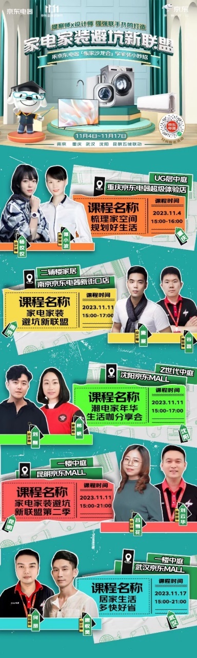 家電家居一體化趨勢下,套系化、場景化成為釋放家庭局改煥新消費潛力的重要需求。“11.11”期間,京東五星電器提案師攜手知名設(shè)計師,強強聯(lián)手共同打造“家電家裝避坑新聯(lián)盟”,即日起至11月17日,南京、重慶、武漢、沈陽、昆明五城聯(lián)動,集聚“家電+設(shè)計+服務”組合能力,屆時歡迎消費者前來京東MALL、京東電器城市旗艦店,參與集家沙龍會,學家裝小妙招,為消費者打造省心、省錢的一站式家電家裝煥新體驗。