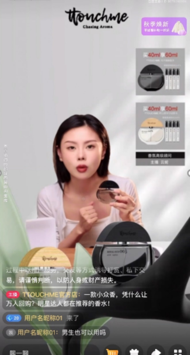 新國貨原創(chuàng)香水品牌“Ttouchme”是百度優(yōu)選的優(yōu)質(zhì)商家。雙十一期間,Ttouchme1:1復(fù)刻了粉絲量最高、銷量TOP1的主播形象打造專屬數(shù)字人, 從形象到聲音足以“以假亂真”,最終達(dá)到訂單量增長100%,有效觀播提升50%,而數(shù)字人主播也成功貢獻(xiàn)了品牌60%GMV。