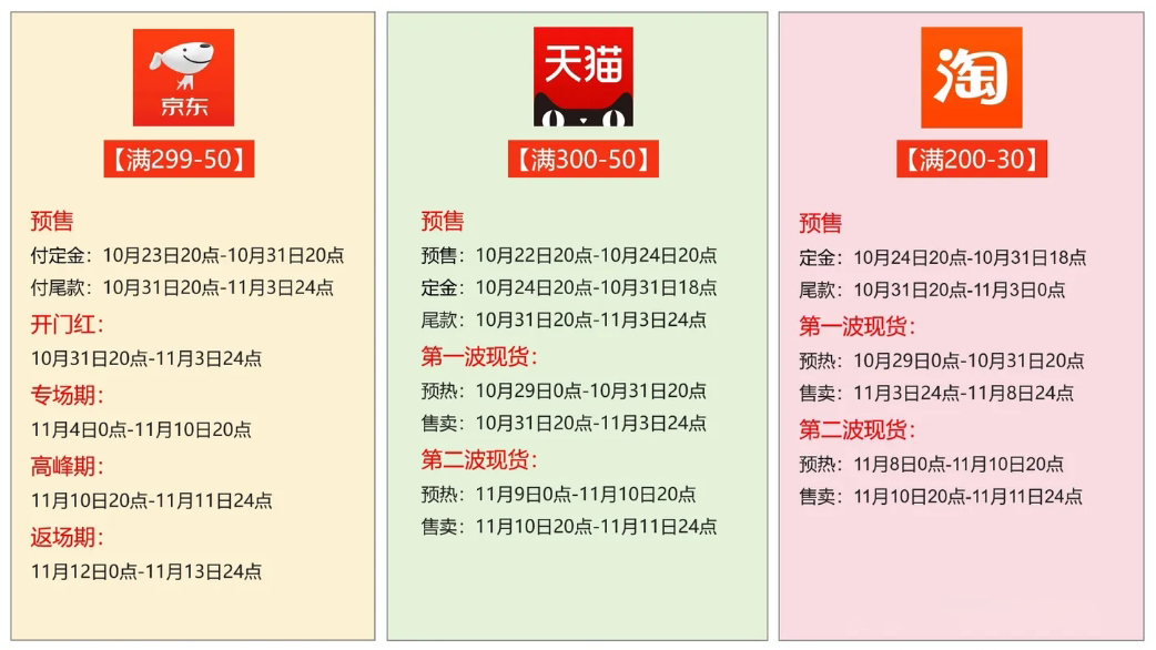 比如,抖音電商現(xiàn)貨銷售的價格最早從10月20日開始,快手電商的預(yù)售則從10月18日開啟,拼多多的大促時間為10月20日-11月13日。