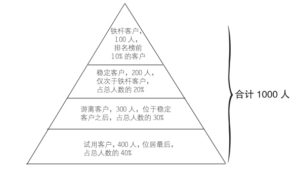 假設(shè)共有1000名客戶,首先,分出排名在前10%的客戶,即“鐵桿客戶”。緊隨其后的20%是“穩(wěn)定客戶”,再之后的30%是“游離客戶”,剩下的40%就是“試用客戶”?蛻舻姆植伎梢娤聢D: