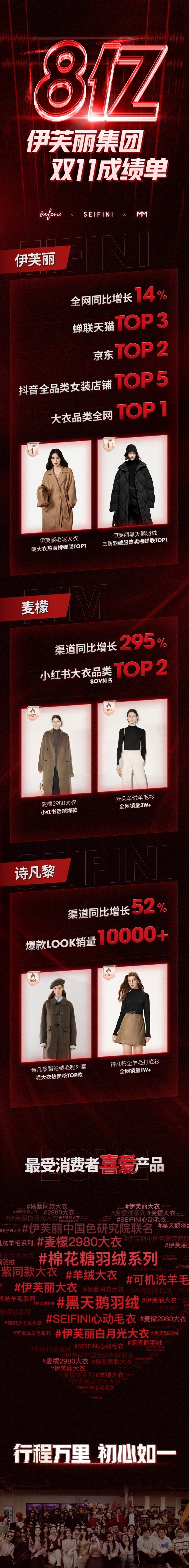 其中,伊芙麗單品牌業(yè)績達成5.95億元,全網(wǎng)同比增長14%,蟬聯(lián)天貓女裝TOP3,京東女裝TOP2,抖音全品類女裝店鋪TOP5,伊芙麗品牌大衣品類排名全網(wǎng)第1。
