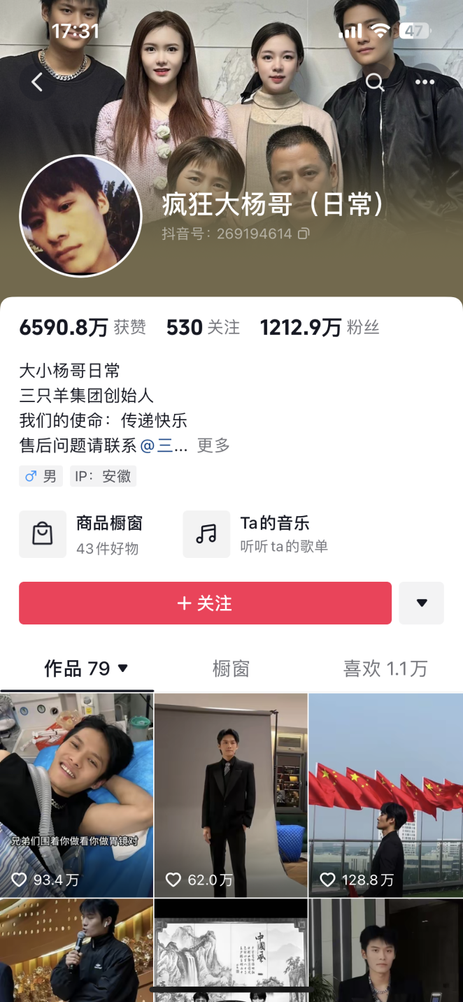 去年3月,小楊哥粉絲突破7000萬,超過劉德華、陳赫等當紅影星,成為抖音粉絲最多的創(chuàng)作達人。值得一提的是,小楊哥的哥哥大楊哥,也擁有超過1000萬粉絲。