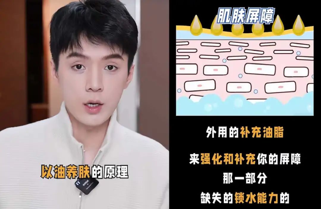 抖音頭部美妝駱王宇宣傳的油敷法打破傳統(tǒng)干皮護(hù)膚的邏輯,在補(bǔ)水的基礎(chǔ)上又加了一個補(bǔ)油。因此,敷面膜不再是簡單的一層膜,還得再買一瓶精油,“只要你皮膚干,一定要試試我這個以油養(yǎng)膚法”。