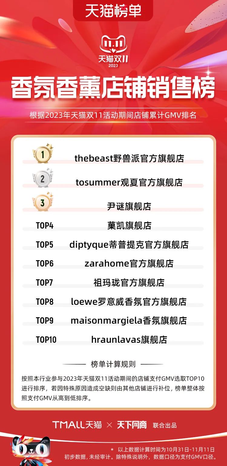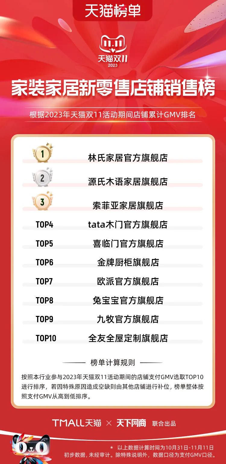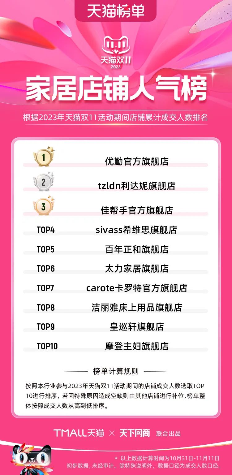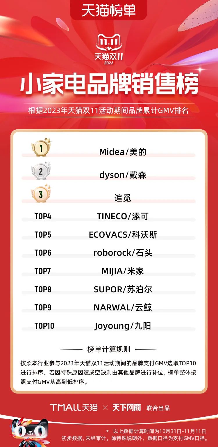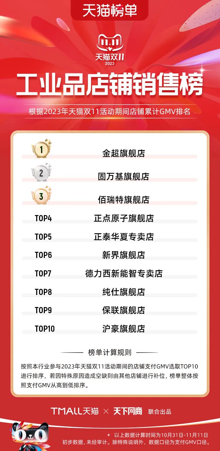 以下為2023年天貓雙11全周期(10月31日-11月11日)榜單: