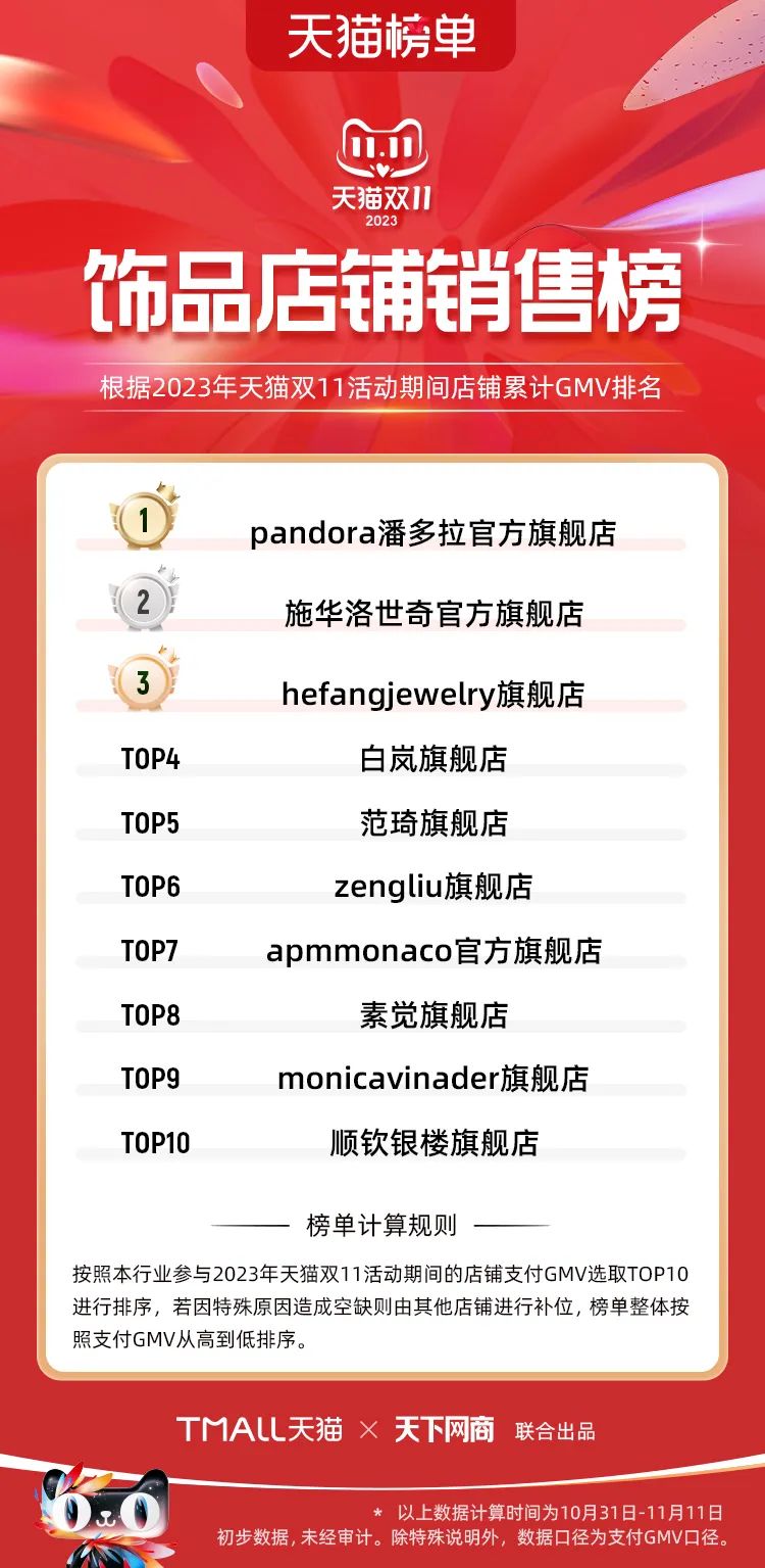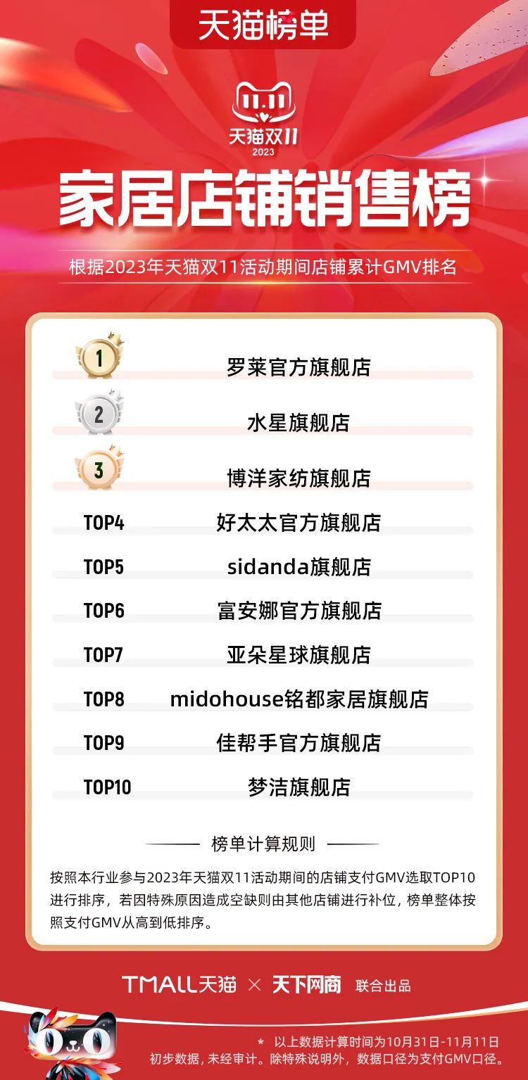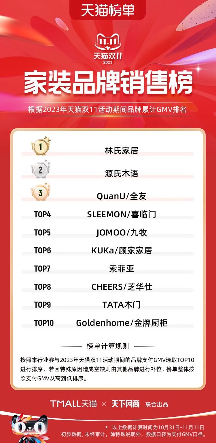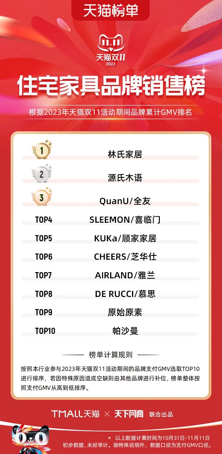 以下為2023年天貓雙11全周期(10月31日-11月11日)榜單: