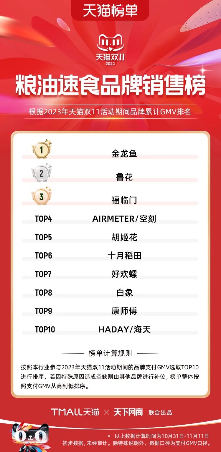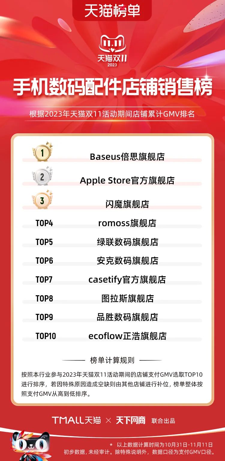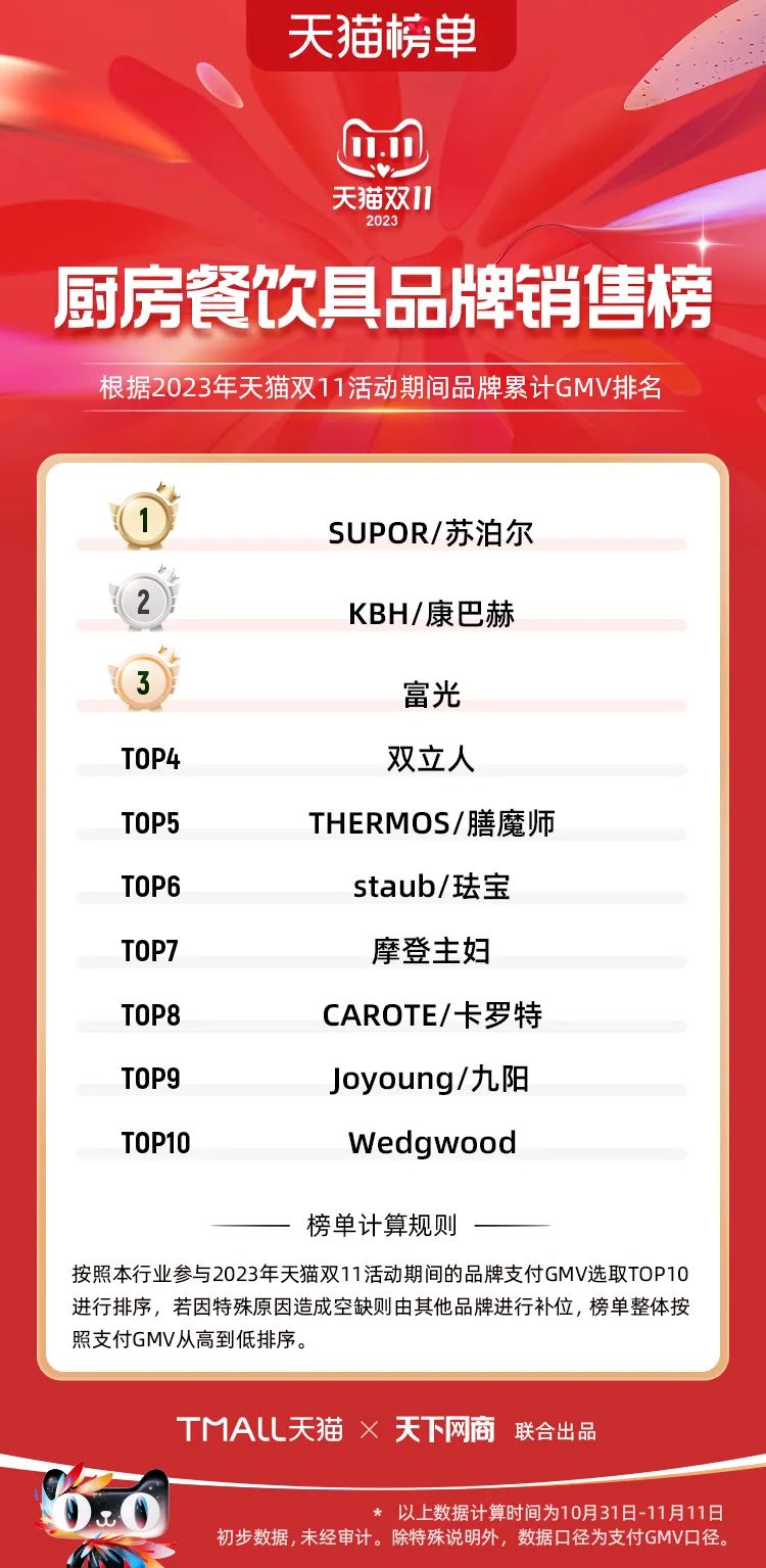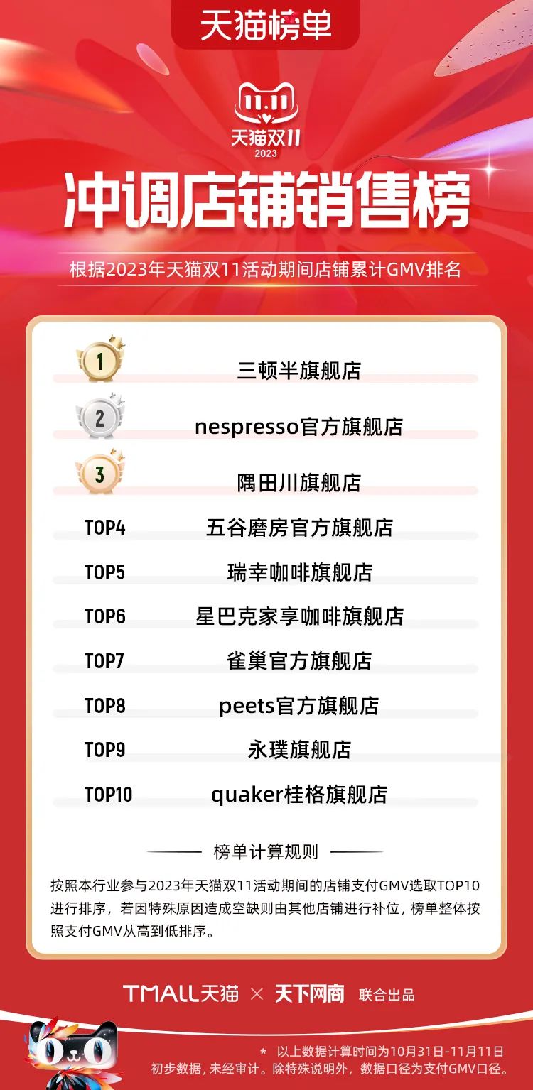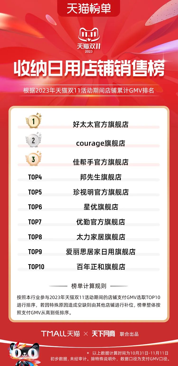 以下為2023年天貓雙11全周期(10月31日-11月11日)榜單: