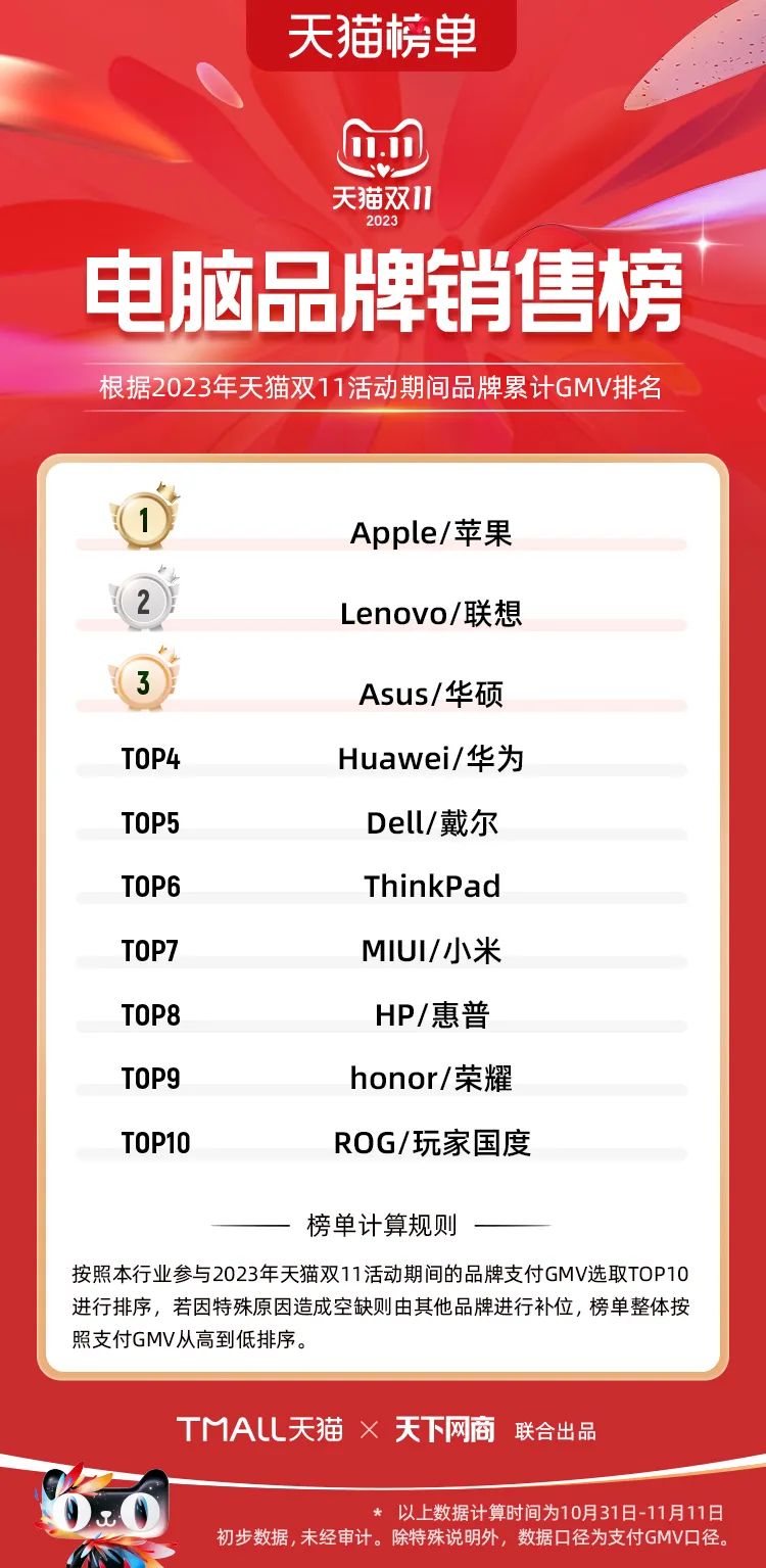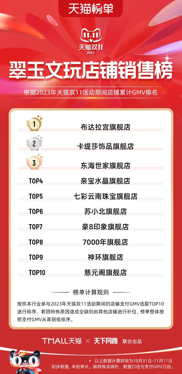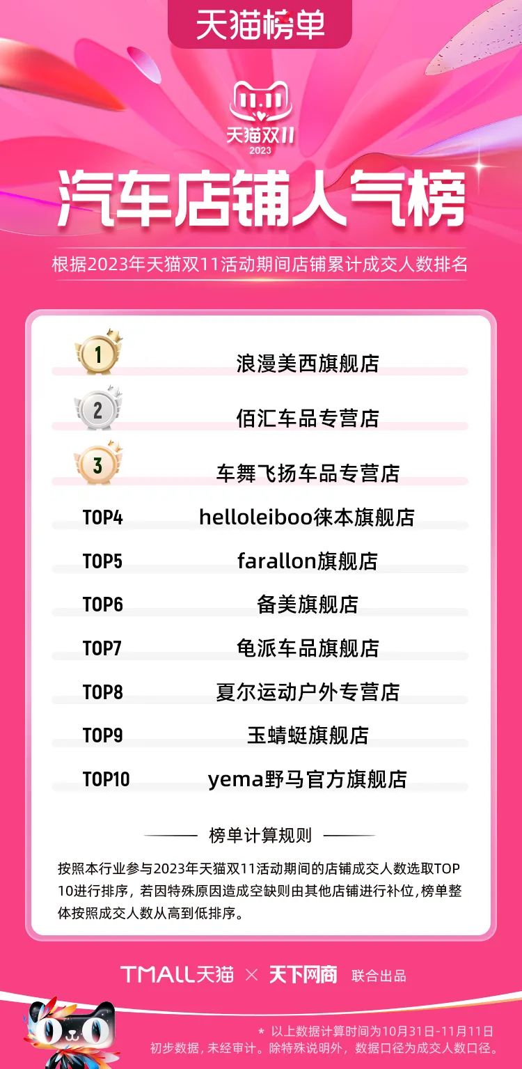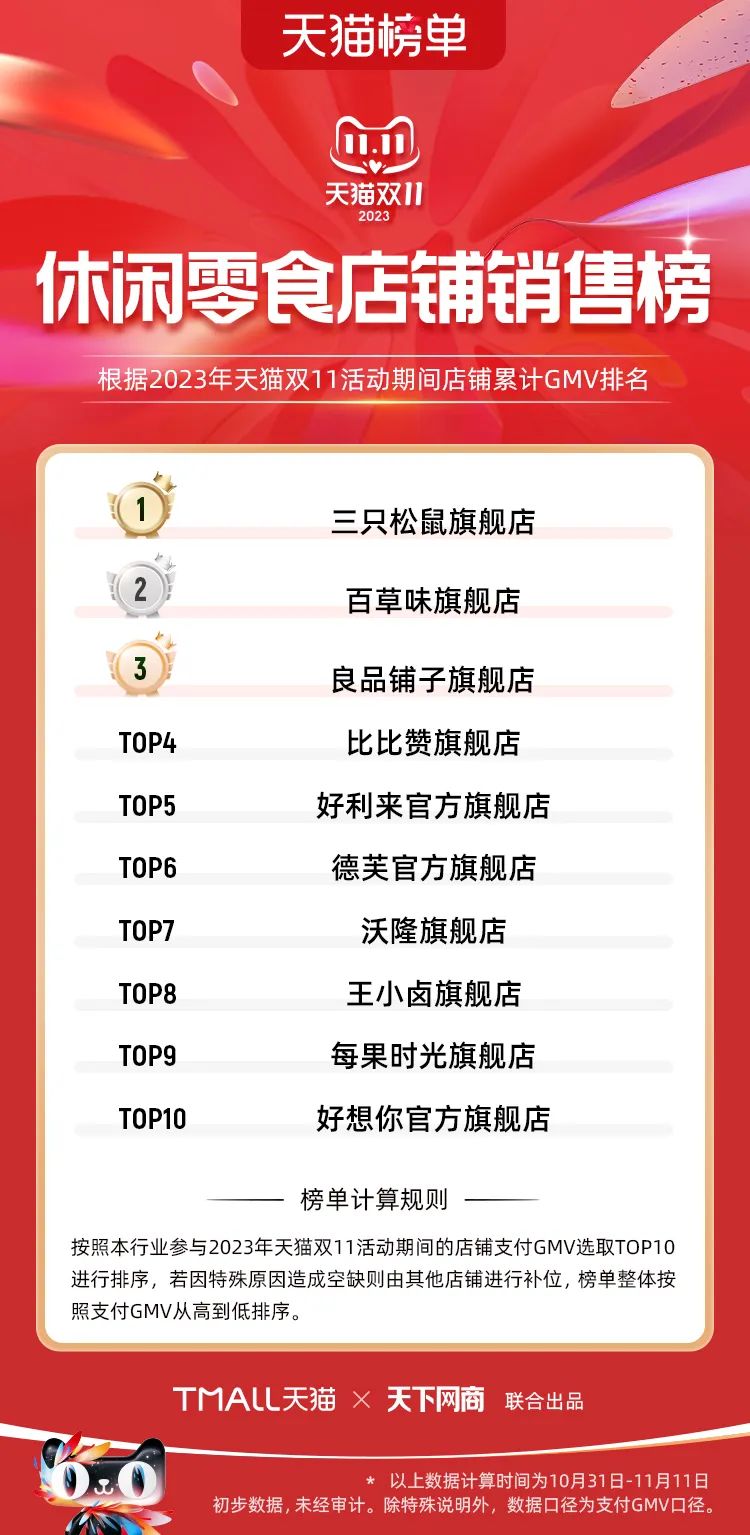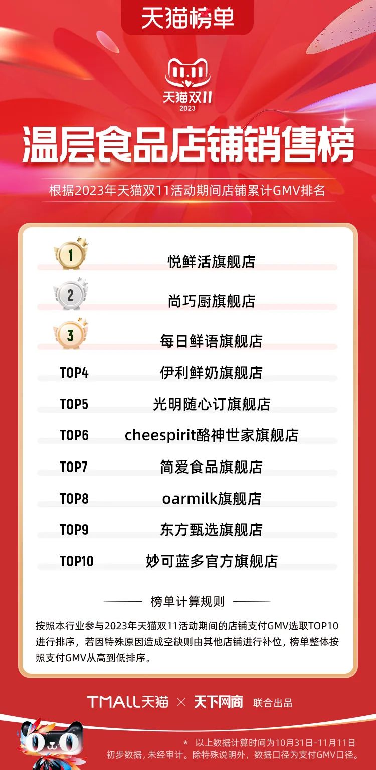 以下為2023年天貓雙11全周期(10月31日-11月11日)榜單: