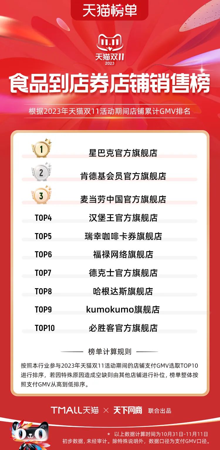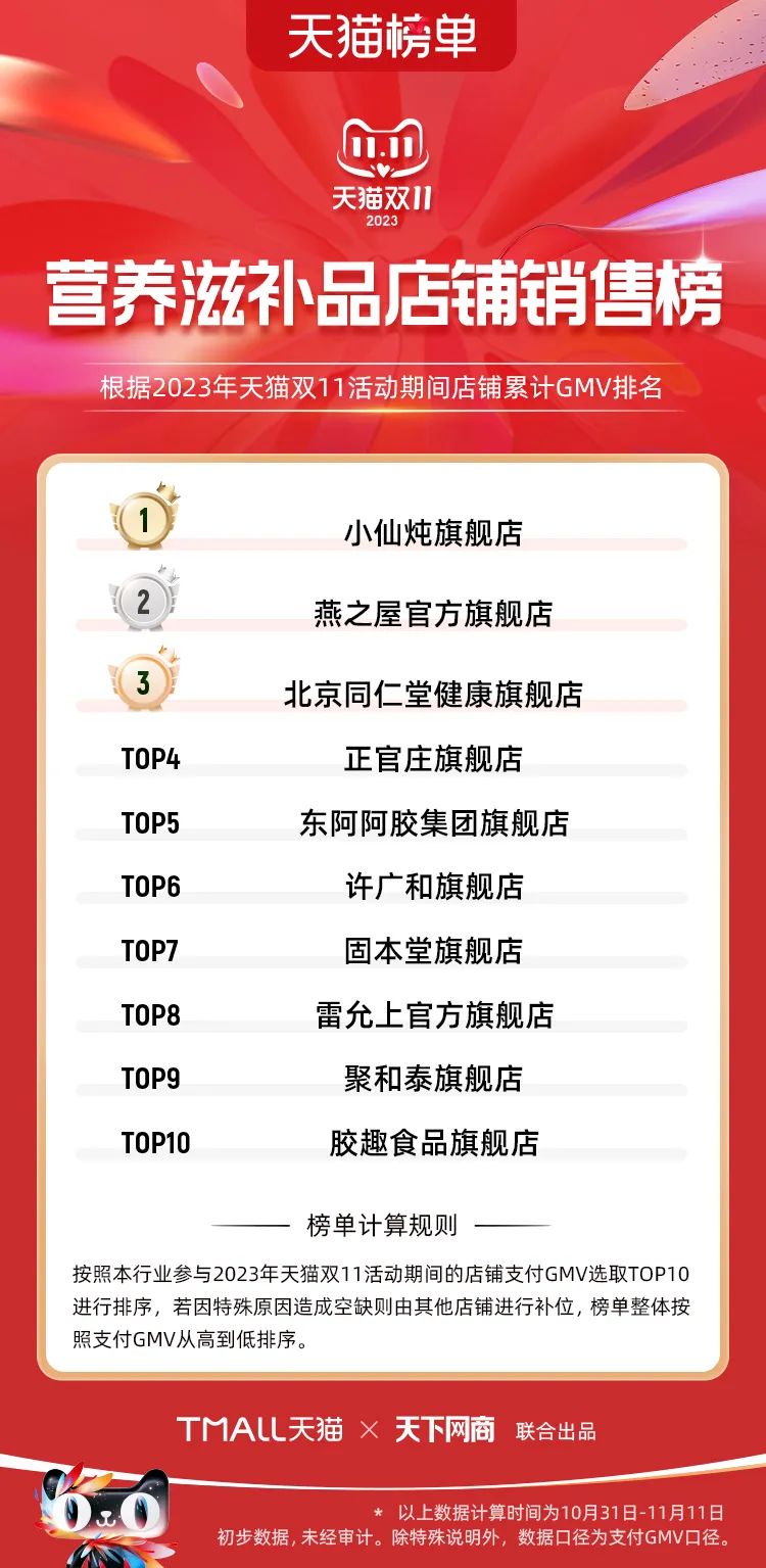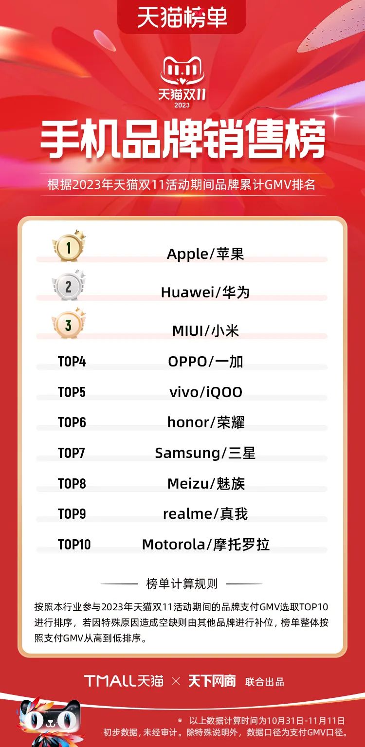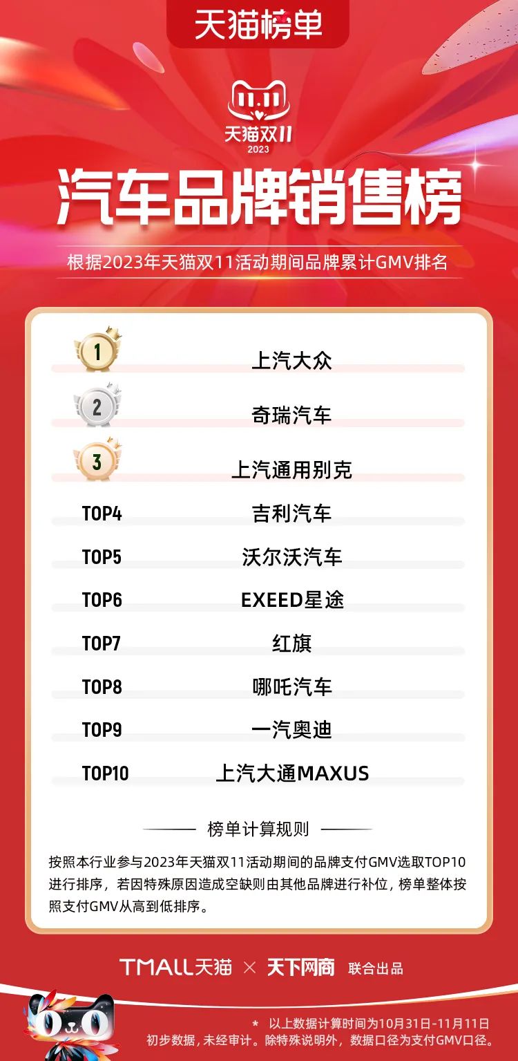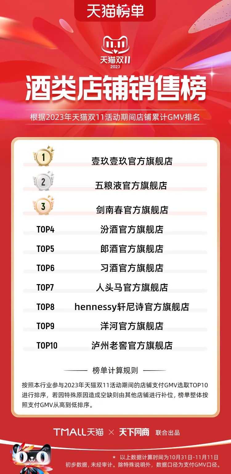 以下為2023年天貓雙11全周期(10月31日-11月11日)榜單: