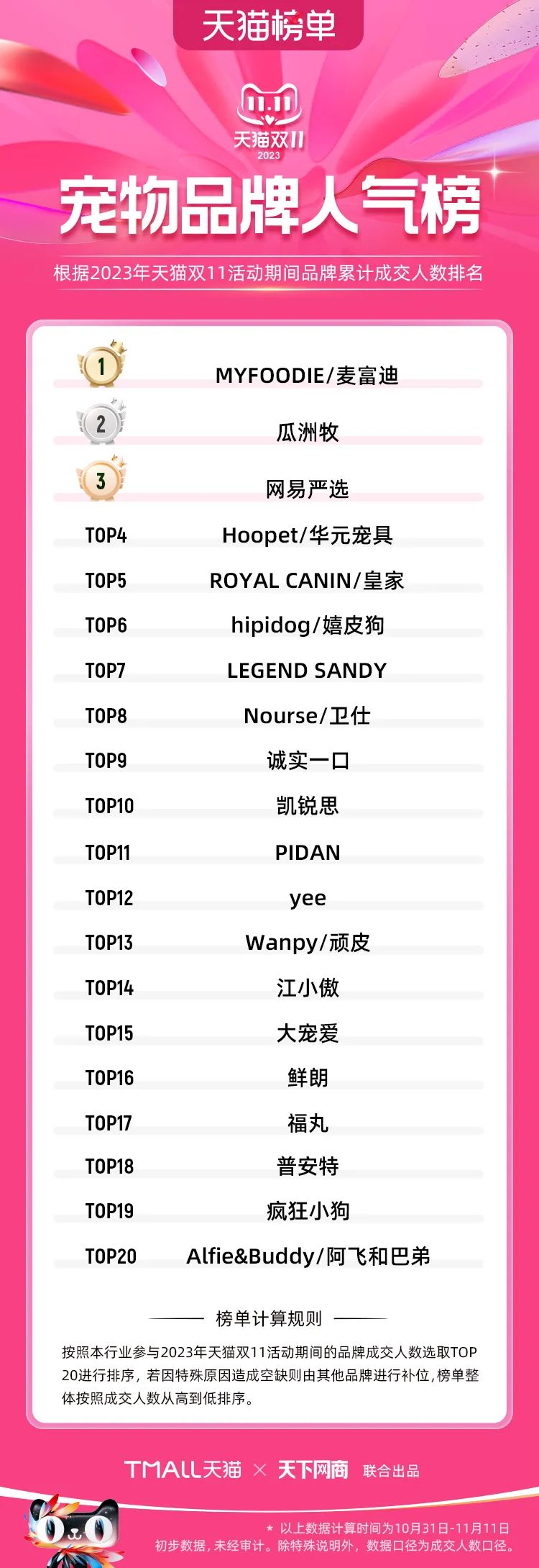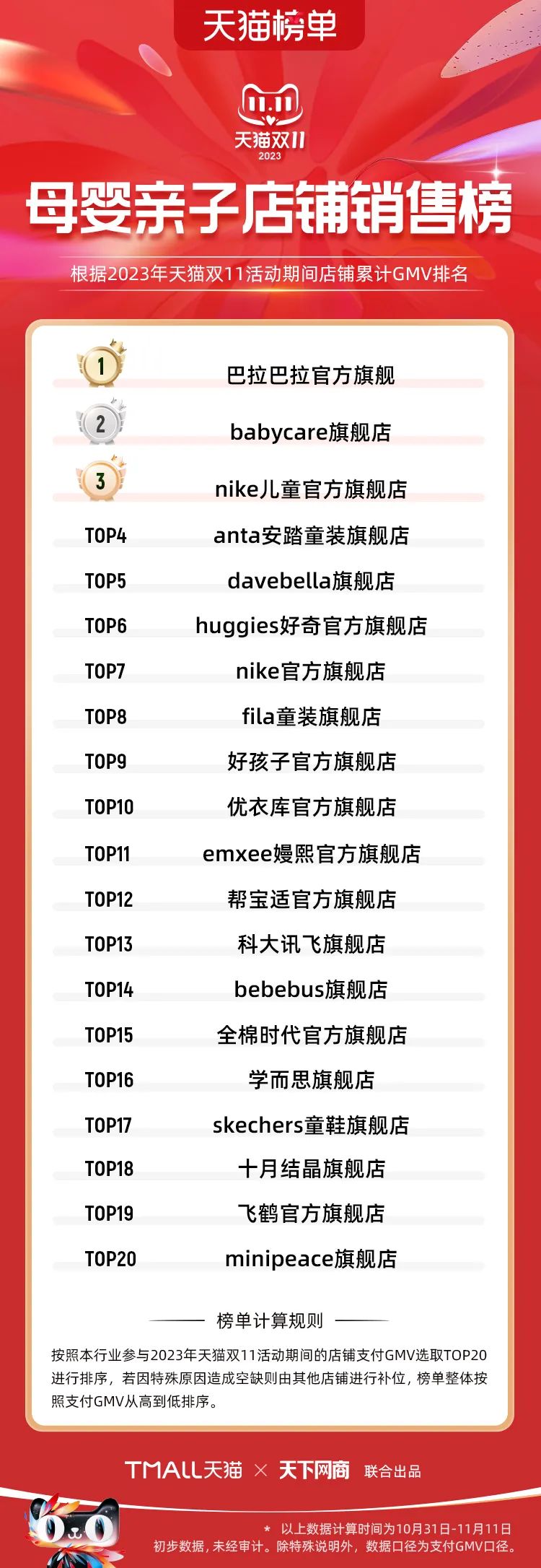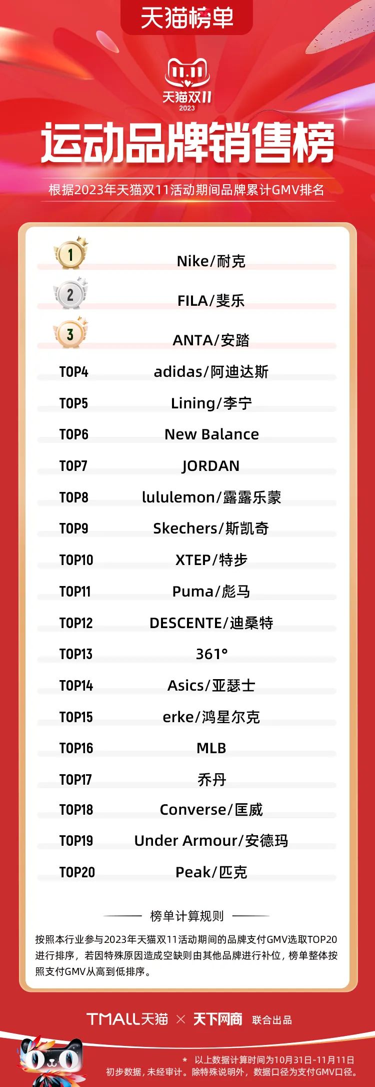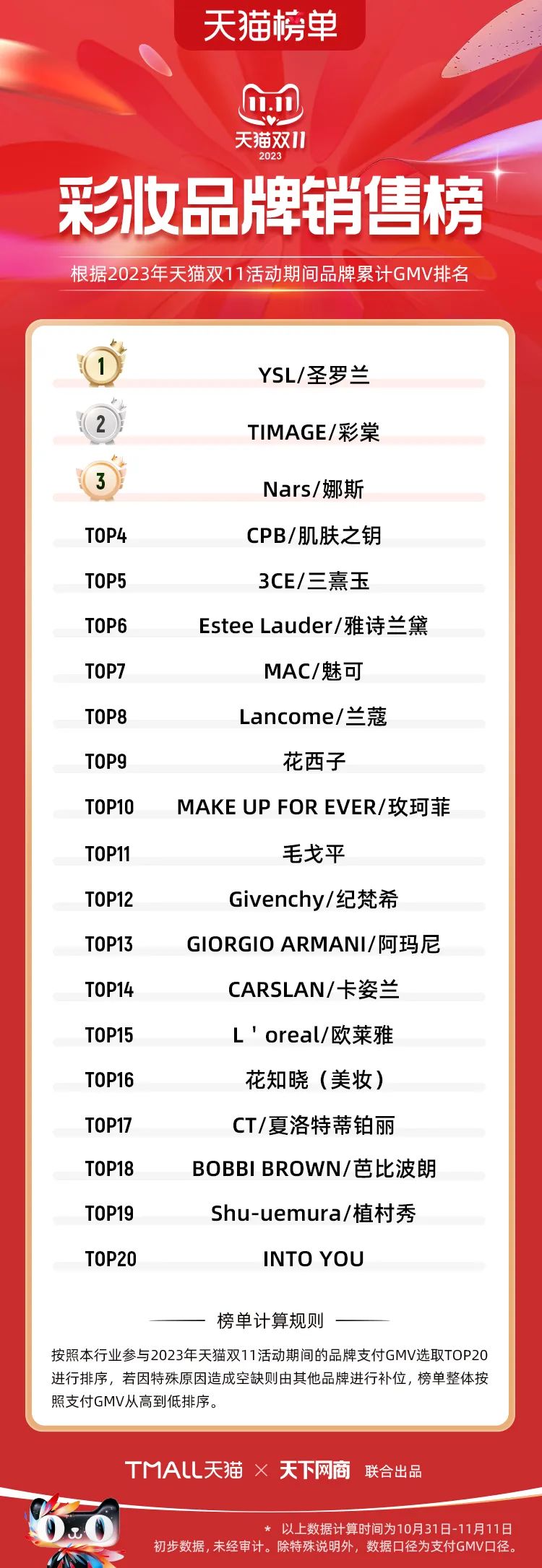 以下為2023年天貓雙11全周期(10月31日-11月11日)榜單: