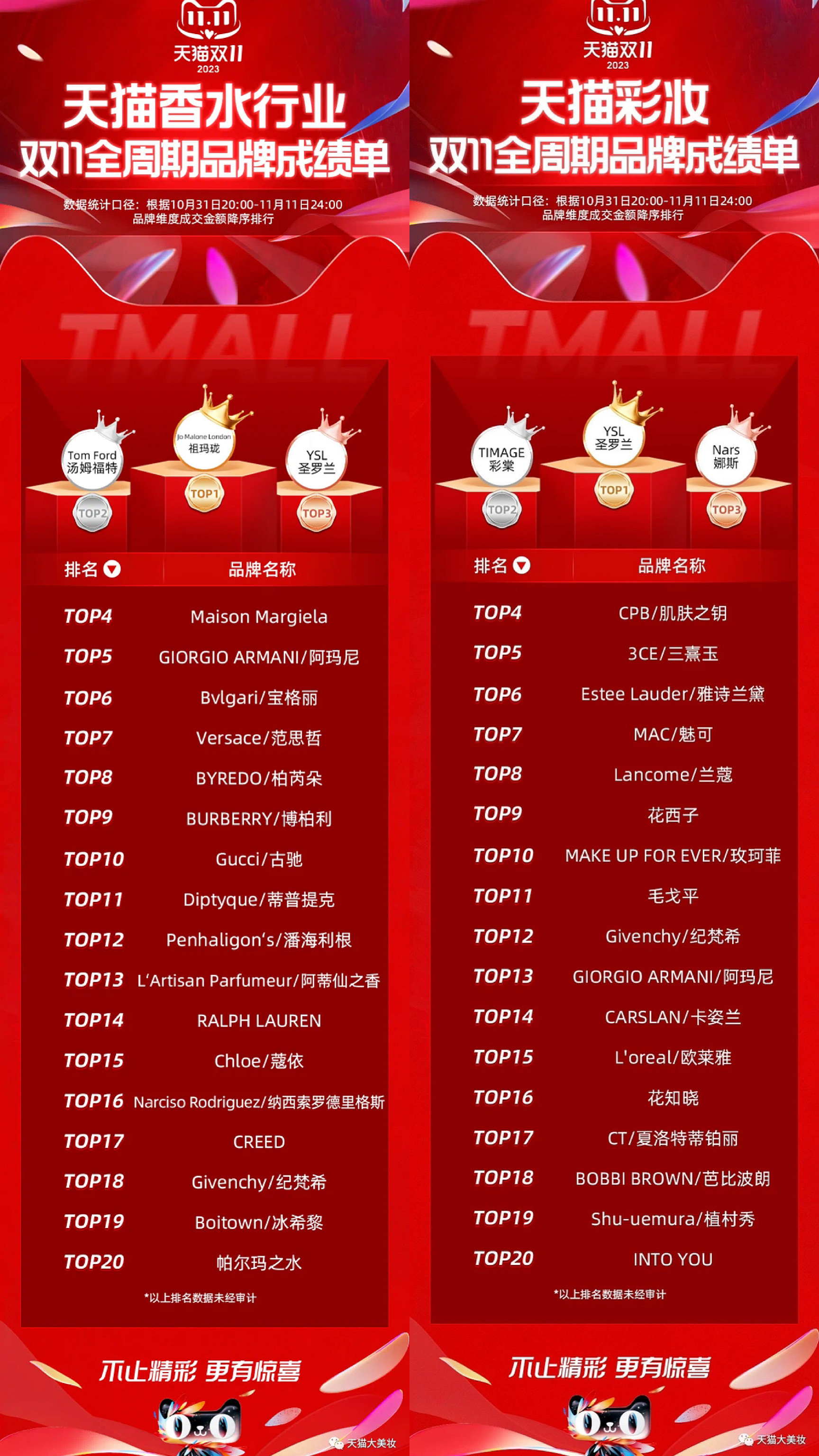 在彩妝方面,圣羅蘭位列第一,珀萊雅旗下彩妝品牌彩棠位列第二,前段時(shí)間屢陷負(fù)面爭議的花西子后來居上,最終位列榜單第九,國貨彩妝第二,算是守住了自己擅長賽道的位置。除此之外,主打中高端市場的毛戈平位列榜單第11,國貨彩妝第三。