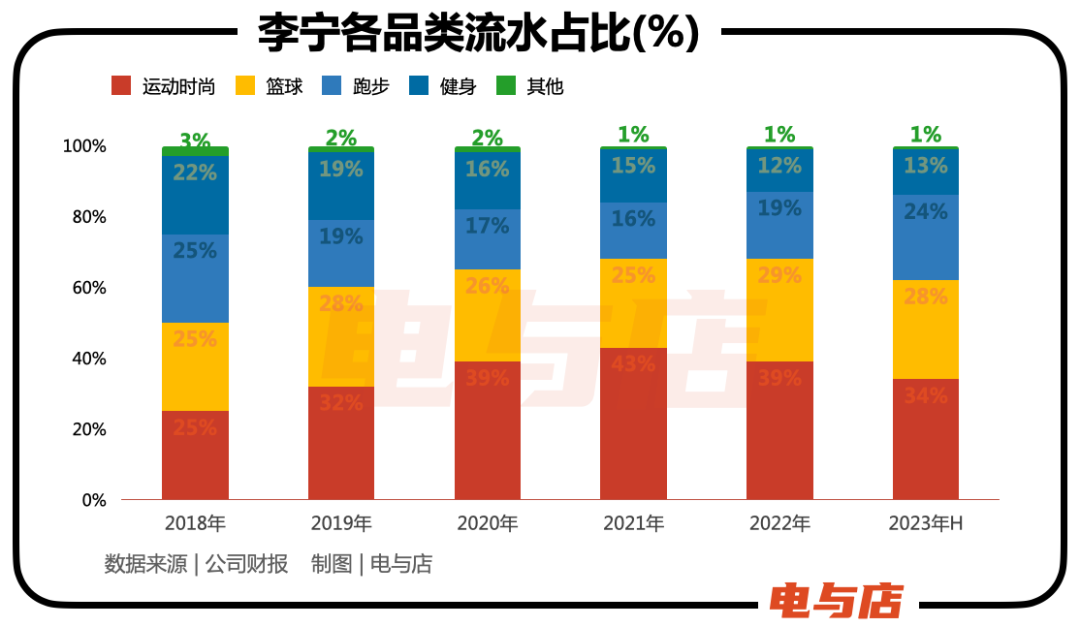 《電與店》通過分析李寧歷年的業(yè)務流水變化發(fā)現(xiàn),“運動時尚板塊的式微”或是關鍵。