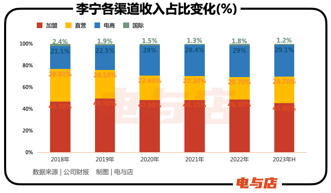 李寧財報數(shù)據(jù)顯示,2018年-2022年,公司直營渠道的收入占比從29.8%降至20.7%,同期電商渠道的收入占比從21.10%上升至29%,直營渠道與電商渠道幾乎走了個對調(diào),加盟渠道略有下降,但占比依然高達45%。