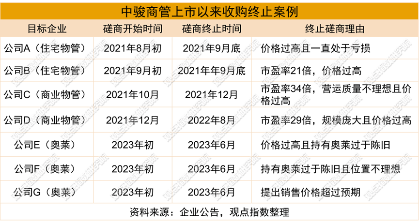 IPO之時,中駿商管計劃將募資款的50%即10.19億元用于收購物業(yè)管理公司及服務(wù)提供商。但自上市以來,其一直未落實大的收并購,在本次收購公告中,中駿商管列舉了其上市以來嘗試的7次收購以及終止的原因,主要在于說明過去市場無有效并購機會,以及更改IPO募資用途用于購買該奧萊商場物業(yè)的必要性。