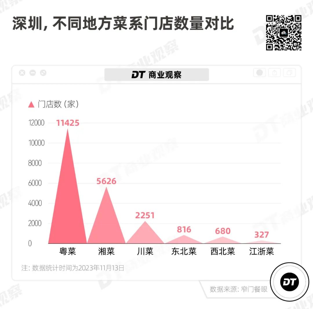 深圳人吃了40年,也成功把湘菜吃成了深圳外來菜系的頂梁柱。對比深圳不同地方菜系的門店數(shù)量,目前湘菜品類在深圳擁有超過5000家門店,比川菜門店數(shù)的兩倍還多。