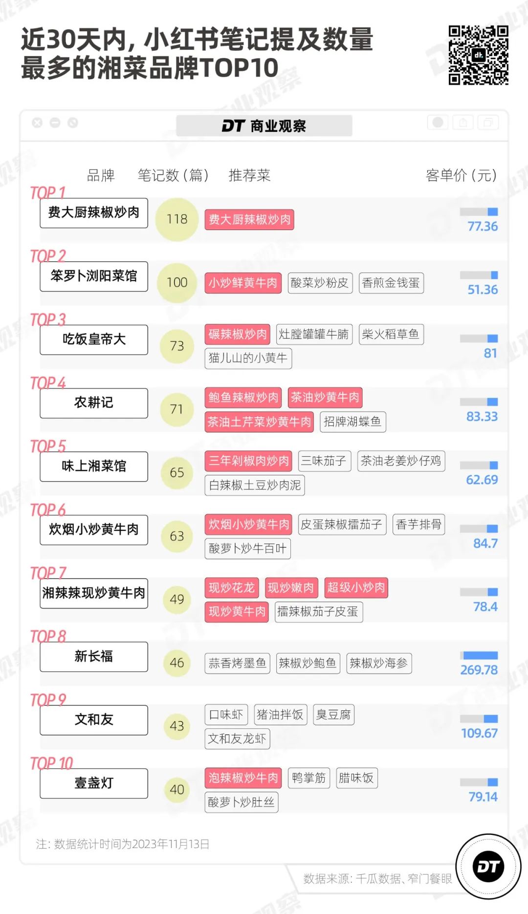 通過千瓜數(shù)據(jù),截至2023年11月13日,近一個月內(nèi),小紅書筆記提及數(shù)量最多的湘菜品牌TOP10中,除了新長福走的是中高端路線,其余品牌客單價基本在60-80元之間。