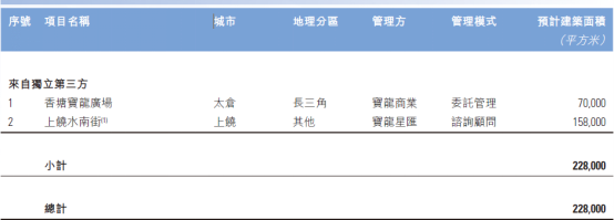 而在2022年全年,在新增的11個(gè)項(xiàng)目中,獨(dú)立第三方項(xiàng)目便有7個(gè)(54萬(wàn)平方米),面積占比近52%,來(lái)自寶龍地產(chǎn)的項(xiàng)目?jī)H有4個(gè)(50萬(wàn)平方米)。