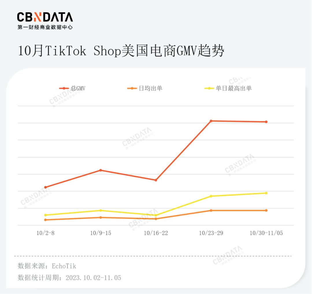 電商數(shù)據(jù)服務(wù)平臺EchoTik數(shù)據(jù)顯示,10月以來,TikTok Shop美國電商GMV呈現(xiàn)一路上漲趨勢,在黑五啟動當(dāng)周,總GMV創(chuàng)下其在美國歷史新高紀(jì)錄—6120萬美元(約4.5億人民幣),環(huán)比增長131%。單日最高出單達(dá)1710萬美元(約1.2億人民幣),可見大促對TikTok Shop在美國地區(qū)的商業(yè)化有著不小的促進(jìn)作用。