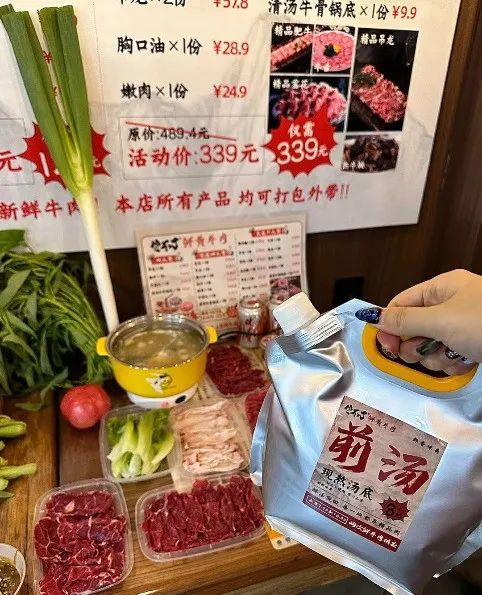 這家杭州菜市場火鍋店主打鮮牛肉,看菜單,他們推的除了2人、4人套餐,就是10人的家庭餐,同時各種標語包括包裝,也都在渲染便于“打包”帶走這點。