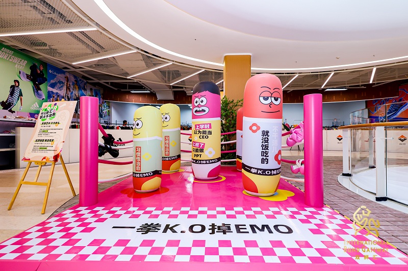 另外,開(kāi)業(yè)期間,商場(chǎng)與知名藝術(shù)家朱敬一先生聯(lián)手,在1樓中庭創(chuàng)作了“反卷藝術(shù)展”,力求以一種詼諧幽默的方式,為職場(chǎng)白領(lǐng)解壓;此外,還有沒(méi)毛病養(yǎng)生局、反EMO拳擊中心等趣味橫生的主題互動(dòng)區(qū),讓年輕群體重拾逛街樂(lè)趣。