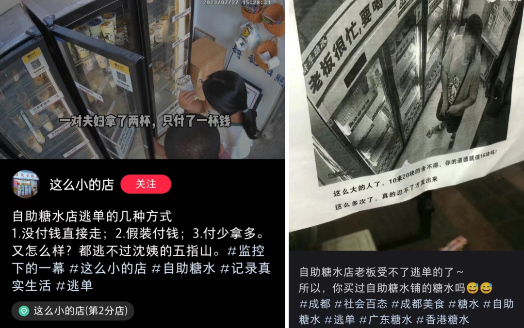 這個(gè)模式中,“人”雖然不存在于店中,卻還是要保持“在場”。一個(gè)原因是要上貨,另一個(gè)原因比較尷尬,要盯“小偷”。自助糖水鋪剛開始創(chuàng)立,許多門店都做出了“老板沒空,自己那就好”的宣傳標(biāo)語,而在門店發(fā)展一段時(shí)間后,慘痛教訓(xùn)讓人成長,“老板沒空”成了“內(nèi)有監(jiān)控”。
