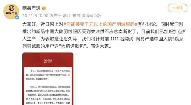 網(wǎng)易嚴(yán)選表示,這件羽絨服是今年雙11期間剛發(fā)布的新品——中國大鵝焱羽絨服,該羽絨服原料成本就要花掉900多元且制作工藝復(fù)雜。據(jù)筆者了解,該商品原料是選用中國皖西大白鵝,生長周期長,絨朵大而飽滿,需要用12只大鵝的絨才能做1件羽絨服。
