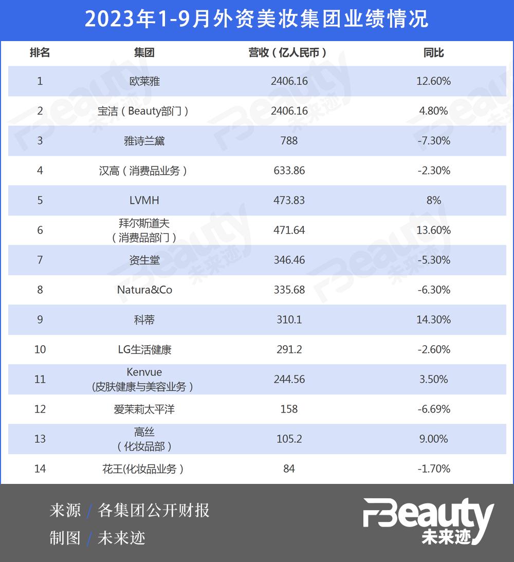 近期,歐萊雅、雅詩(shī)蘭黛、寶潔、資生堂等14家外資美妝集團(tuán)陸續(xù)發(fā)布了最新業(yè)績(jī)報(bào)告。據(jù)《FBeauty未來(lái)跡》統(tǒng)計(jì),2023年前九個(gè)月,全球14大美妝集團(tuán)實(shí)現(xiàn)銷售額共計(jì)約7470億元人民幣。