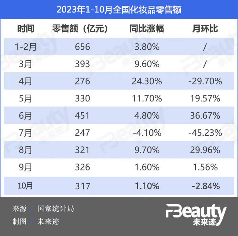 國(guó)家統(tǒng)計(jì)局公布的數(shù)據(jù)顯示,今年1-10月份,社會(huì)消費(fèi)品零售總額38.54萬(wàn)億元,同比增長(zhǎng)6.9%。其中化妝品類10月銷售額同比增長(zhǎng)1.1%至317億元,前10個(gè)月零售總額為3291億元,同比增長(zhǎng)6.2%,略低于大盤增長(zhǎng)速度。