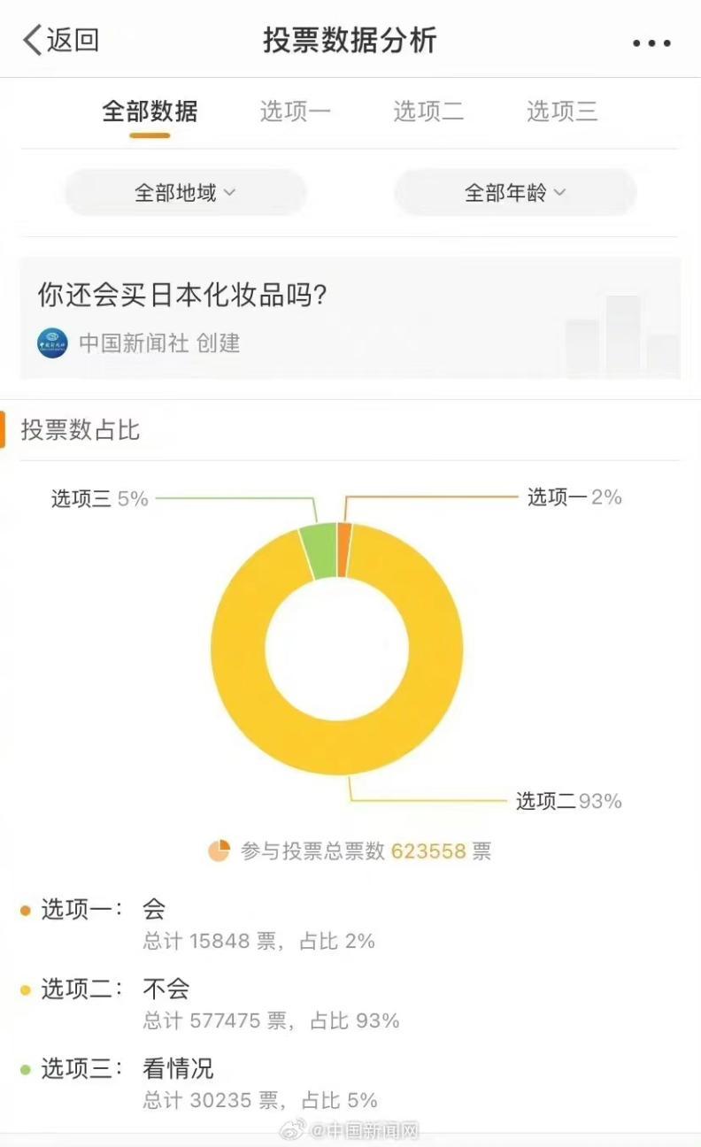 此前由中國(guó)新聞社創(chuàng)建的#你還會(huì)買日本化妝品嗎#的投票中,有超過(guò)62萬(wàn)人參與投票,其中有57萬(wàn)余人選擇了“不會(huì)再買”,占比達(dá)到93%。