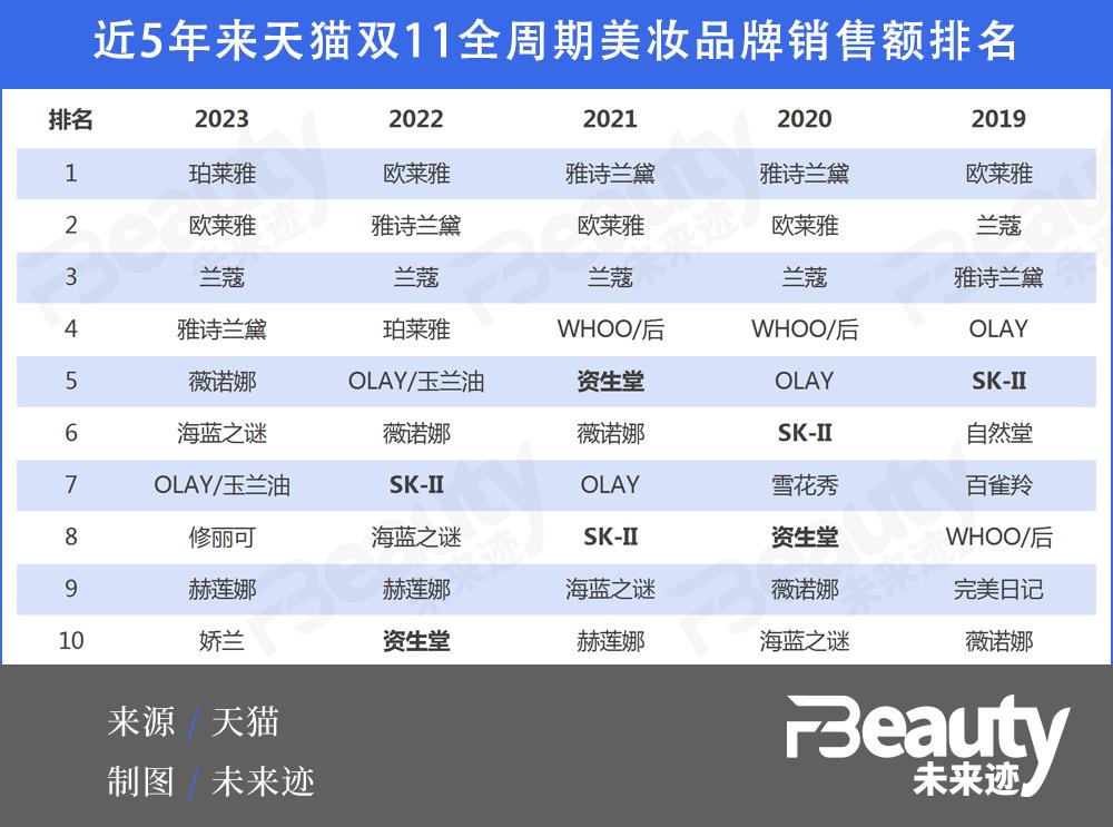 在天貓公布的美妝行業(yè)雙11全周期品牌成績(jī)單中,TOP10中已無(wú)日系品牌的身影,榜單中SK-II、CPB、資生堂分別排名第11、第13、第14位。這也是近5年以來(lái),SK-II與資生堂首次雙雙跌落美妝品牌前十的位置。