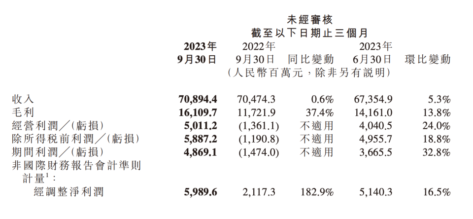 數(shù)據(jù)顯示,2023年三季度營(yíng)收為708.9億元,市場(chǎng)預(yù)估704.6億元,同比增長(zhǎng)0.6%。經(jīng)調(diào)整凈利潤(rùn)為60億元,同比增長(zhǎng)182.9%,前三季度經(jīng)調(diào)整凈利潤(rùn)為去年全年的1.7倍。
