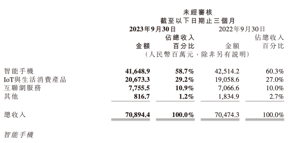 2023年第三季度,智能手機(jī)業(yè)務(wù)收入為416億元。全球智能手機(jī)出貨量為4180萬(wàn)臺(tái),同比增長(zhǎng)4.0%,環(huán)比增長(zhǎng)27.0%。