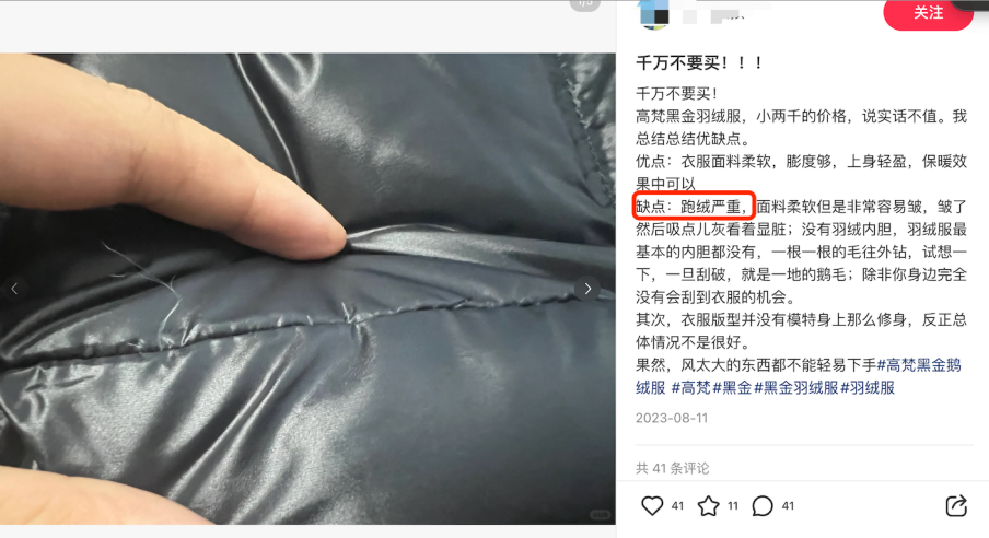 在小紅書(shū)上,除了鋪天蓋地的種草文外,也有部分爭(zhēng)議與之并存,其中不乏對(duì)高梵黑金羽絨服破損、易刮爛、跑絨嚴(yán)重、售后服務(wù)不滿(mǎn)等。