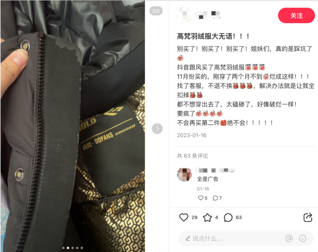 小紅書(shū)博主發(fā)帖表示,在抖音跟風(fēng)買(mǎi)了高梵羽絨服,穿了兩個(gè)月不到領(lǐng)口有明顯破損痕跡,客服表示不退不換,“不會(huì)再買(mǎi)第二件了”,該博主表示。