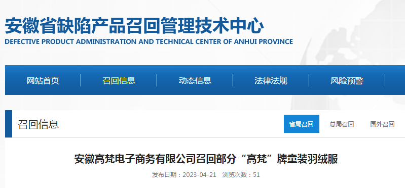 值得注意的是,今年4月高梵還召回了一批因質(zhì)量不符合要求的童裝羽絨服。根據(jù)安徽省缺陷產(chǎn)品召回管理技術(shù)中心公開(kāi)消息顯示,安徽高梵電子商務(wù)有限公司按照《消費(fèi)品召回管理暫行規(guī)定》的要求,向安徽省市場(chǎng)監(jiān)督管理局、合肥市市場(chǎng)監(jiān)督管理局報(bào)告了召回計(jì)劃,自即日起,召回2022年4月16日生產(chǎn)的“高梵”牌G3210041款童裝羽絨服,涉及數(shù)量35件。