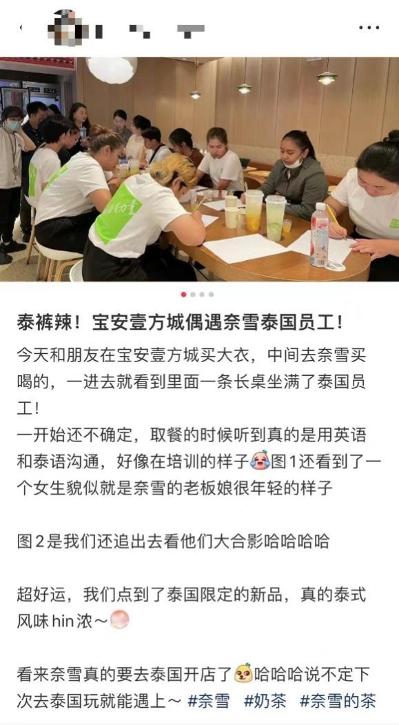 11月21日消息,有網(wǎng)友近日在奈雪的茶深圳門店偶遇其泰國員工。社交平臺曬出的圖片顯示,數(shù)名身著奈雪統(tǒng)一工服的員工圍坐在門店內(nèi)品嘗茶飲,交流均使用泰語。