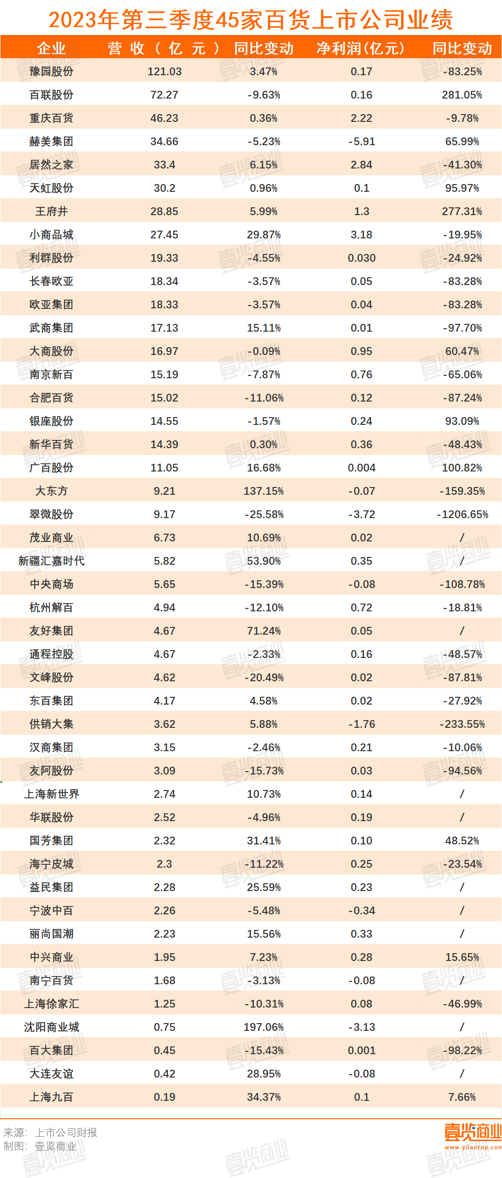 三季度百貨依舊渡劫,45家上市公司凈利潤僅0.6億