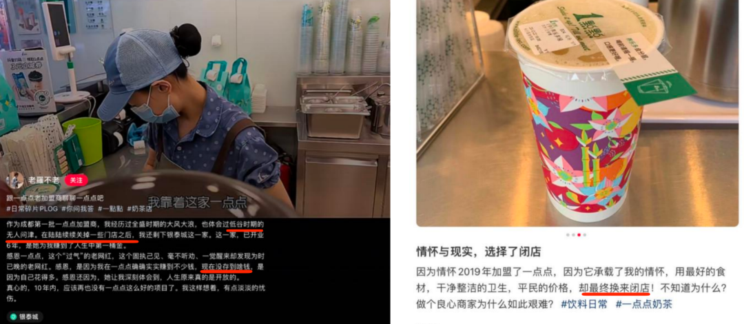 小紅書、微博等社交媒體平臺上,有加盟商反映現(xiàn)在利潤不到10%,只能在殘酷的現(xiàn)實面前選擇閉店。1點點和加盟商相輔相成,加盟商的離場對于1點點來說無疑是致命的打擊。