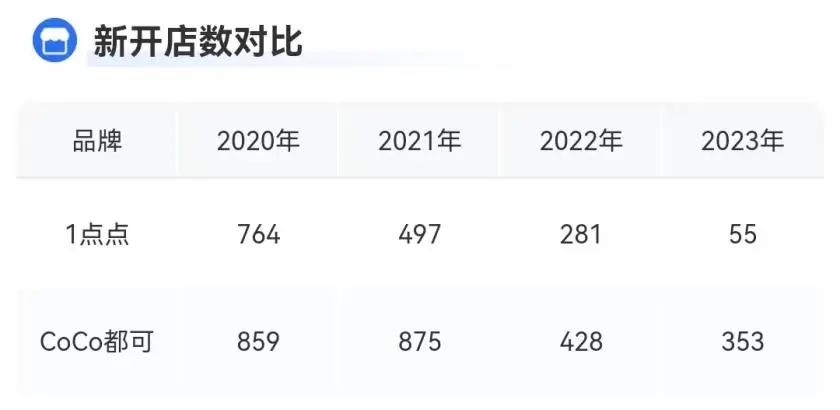 與此同時,1點點新開門店數(shù)量逐年遞減,23年僅僅新開了55家。與1點點客單價相近且均對標中端市場的COCO開店數(shù)量雖也呈下降趨勢,但二者開店數(shù)量的差距卻越來越大,從一開始的1倍增長至6倍。