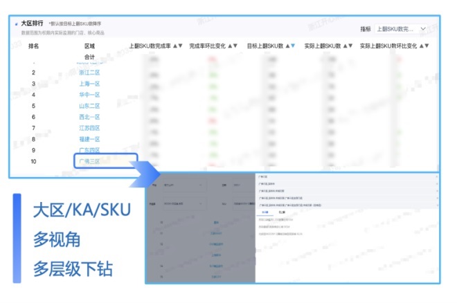 數(shù)字化產(chǎn)品工具的使用讓總部O2O經(jīng)理能夠直接統(tǒng)籌全局,俯瞰零售、大區(qū)、品項(xiàng)的上翻目標(biāo)達(dá)成情況,快速定位當(dāng)前供給存在的問題,將時(shí)間和精力聚焦于經(jīng)營(yíng)決策的調(diào)整;也讓各大區(qū)總監(jiān)和區(qū)域經(jīng)理清晰洞察管轄范圍內(nèi)的零售情況,在選品優(yōu)化、安全庫存設(shè)定和精準(zhǔn)促銷上有數(shù)可依。
