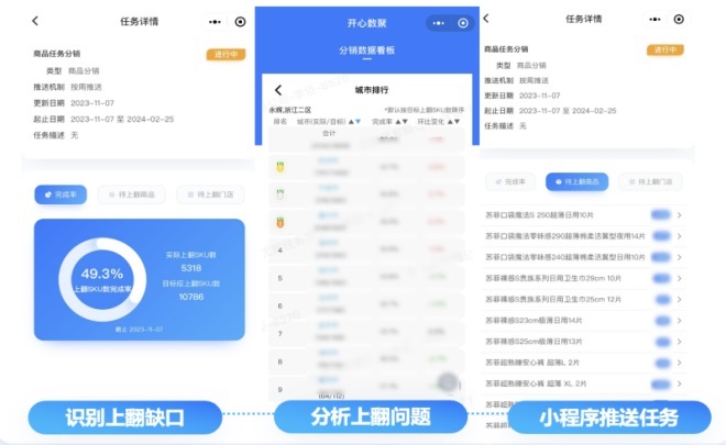 而小程序端精準(zhǔn)到人的每周分銷任務(wù)推送讓業(yè)務(wù)人員實(shí)現(xiàn)了在「云端」巡店,隨時(shí)掌握每一家門店的SKU上翻缺口,根據(jù)任務(wù)推送高效執(zhí)行,讓供給上翻計(jì)日程功。