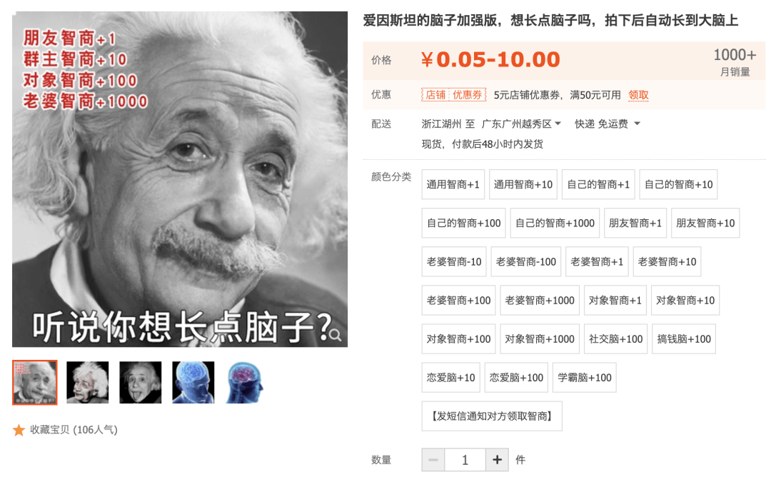 在淘寶等電商平臺(tái),學(xué)子們熱衷于花1分到5毛下單一個(gè)“愛(ài)因斯坦的腦子”,認(rèn)為這可以提供“智力加持”(商家通過(guò)聊天框給付費(fèi)用戶發(fā)一張愛(ài)因斯坦的圖片)。