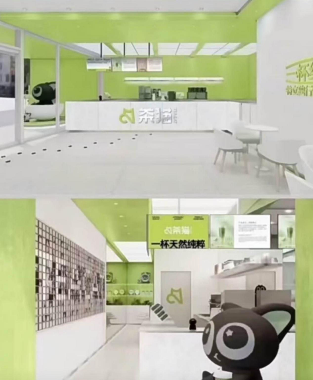 Tea cat茶貓品牌設(shè)計采用綠色及白色色彩搭配的品牌設(shè)計,在視頻中茶貓共有三種類型的門店,庫迪并未對店鋪類型做出明確命名。不過從圖片觀察來看茶貓的三種店型與庫迪咖啡現(xiàn)有的品牌店、店中店、快取店的大小基本一致。